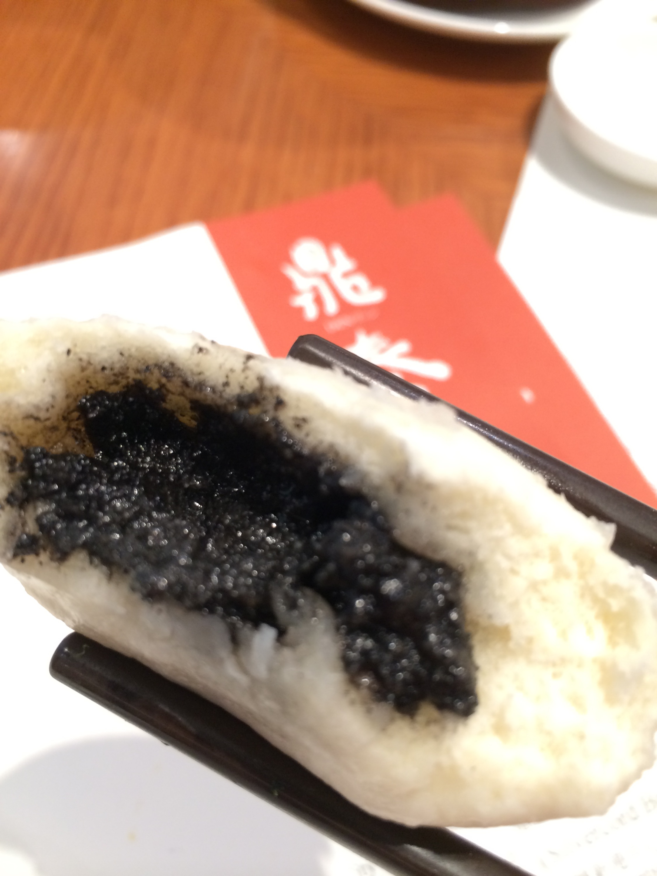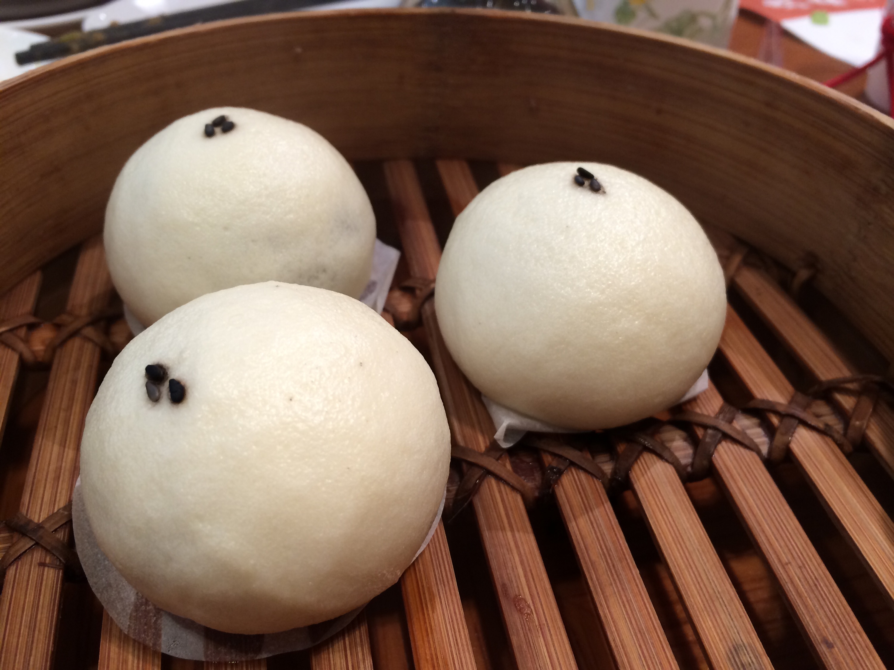 Basically this is a steamed bun, filled with black sesame paste. Black sesame tastes a bit like peanut butter with a little sesame oil and bitterness added to it. I love it. In fact I love the flavor so much that I will buy anything I see with that flavor – like for example the Hong Kong mcdonalds sometimes has it as a sundae topping, and I go nuts. 😉
