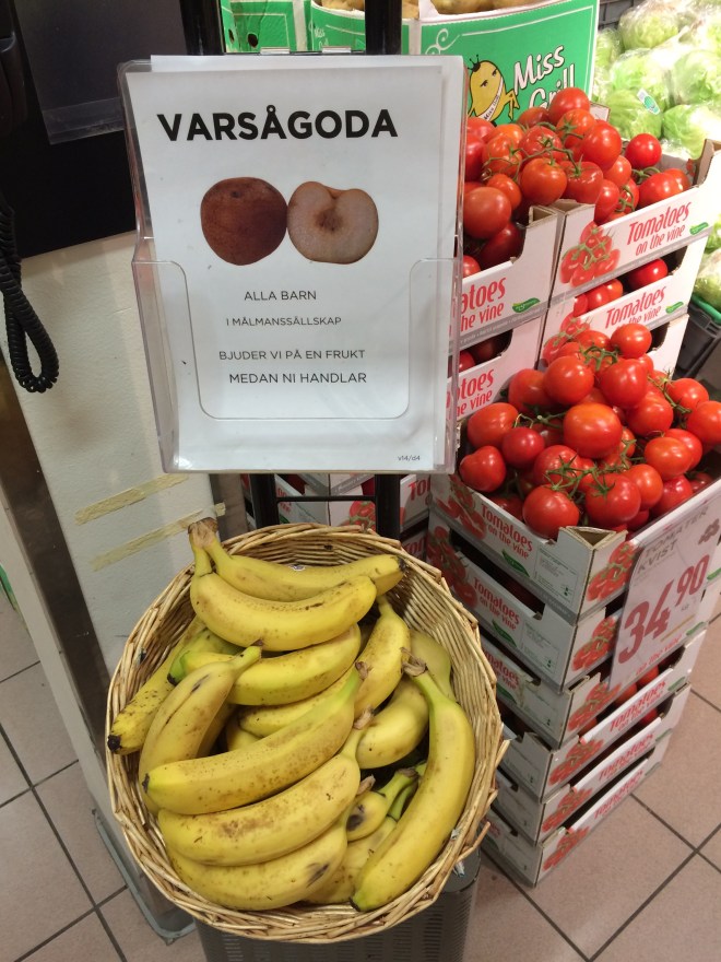 One thing I think is unique and interesting about the supermarkets in Sweden (aside from the organic produce being almost the same price as regular produce) is that they give you free bananas to give to your child while you are shopping.  Crazy, right?!