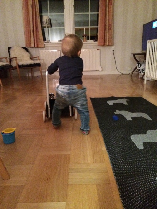 The little guy has really been moving a lot! He has had a good combination thus far while back in Sweden: he has been healthy, he has had a lot of space, he has had a lot of people to play with him. And the end result of that is a very energetic little one who is now up on two feet just as much as he crawls.